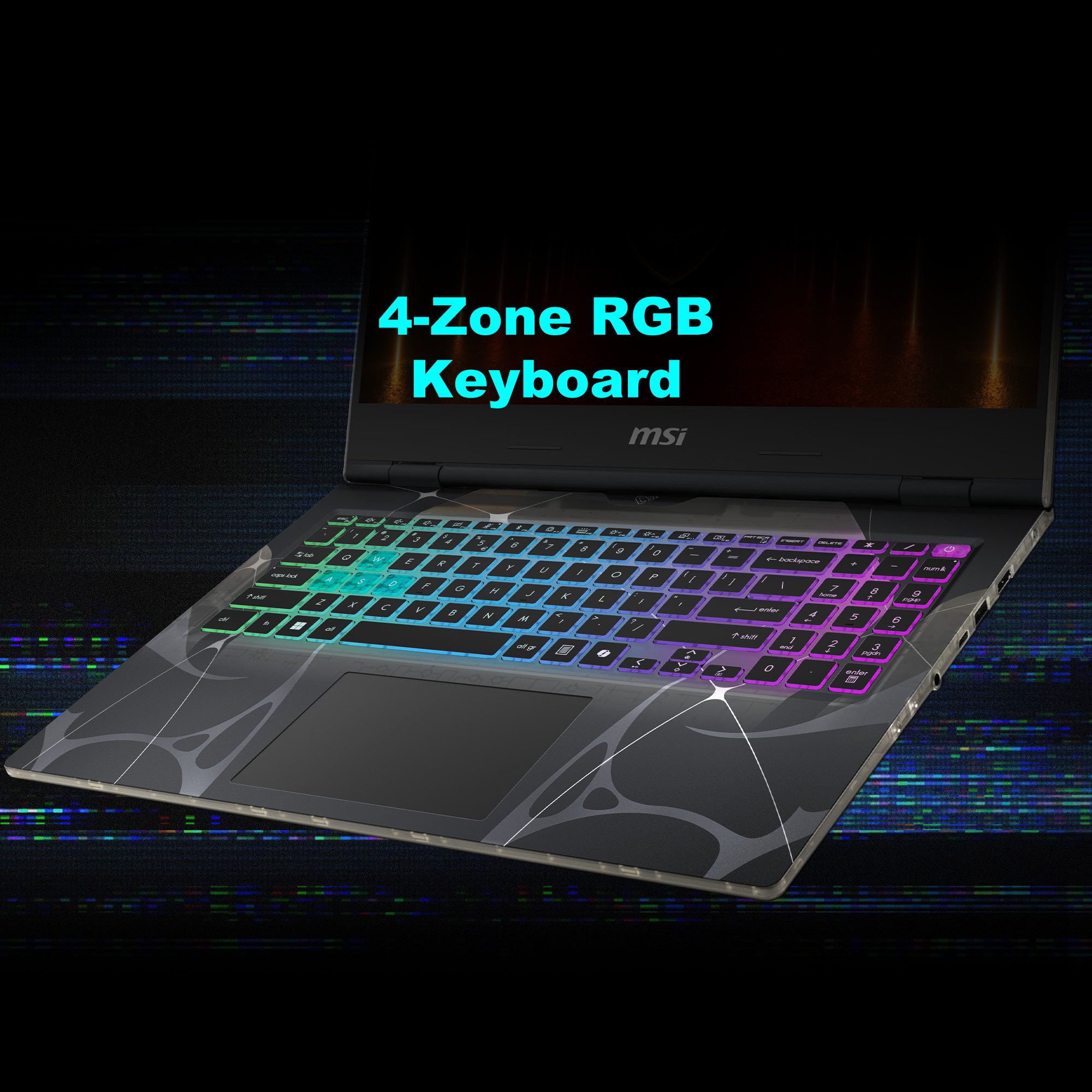 - Teclado RGB de 4 zonas con teclas WASD resaltadas.