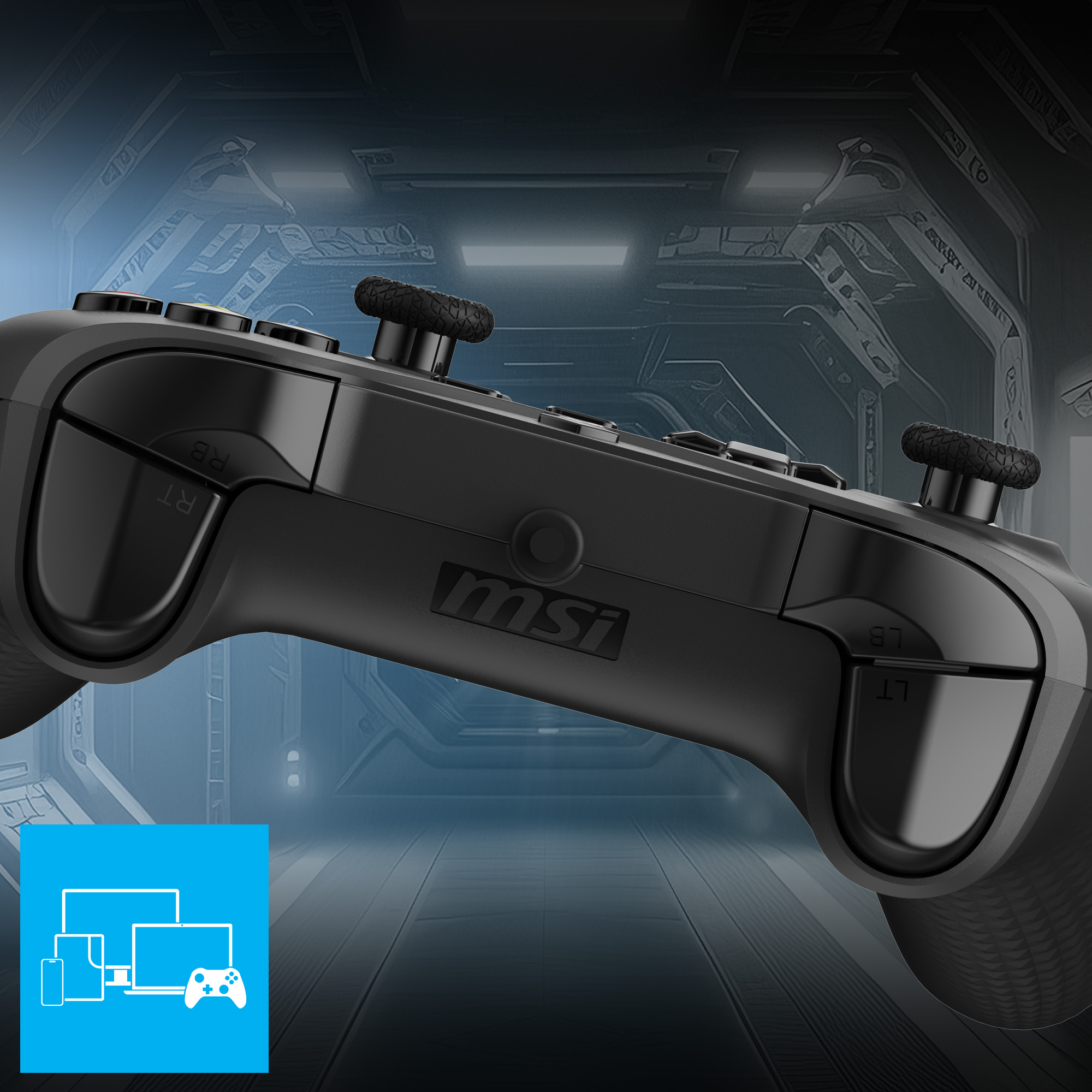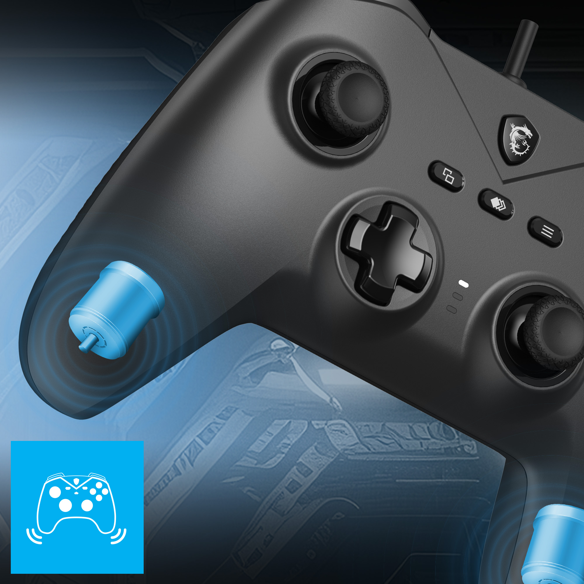Diseñado para gamers que exigen una precisión y excelencia ergonómica superiores, el MSI FORCE GC200 ofrece una gran ventaja gracias a sus gatillos con efecto Hall para una respuesta precisa y rápida, y sus avanzados joysticks analógicos para un control suave y exacto. La retroalimentación háptica inmersiva de sus dos motores de vibración intensifica la experiencia sensorial, mientras que el agarre texturizado antideslizante garantiza comodidad y seguridad en cada sesión intensa.