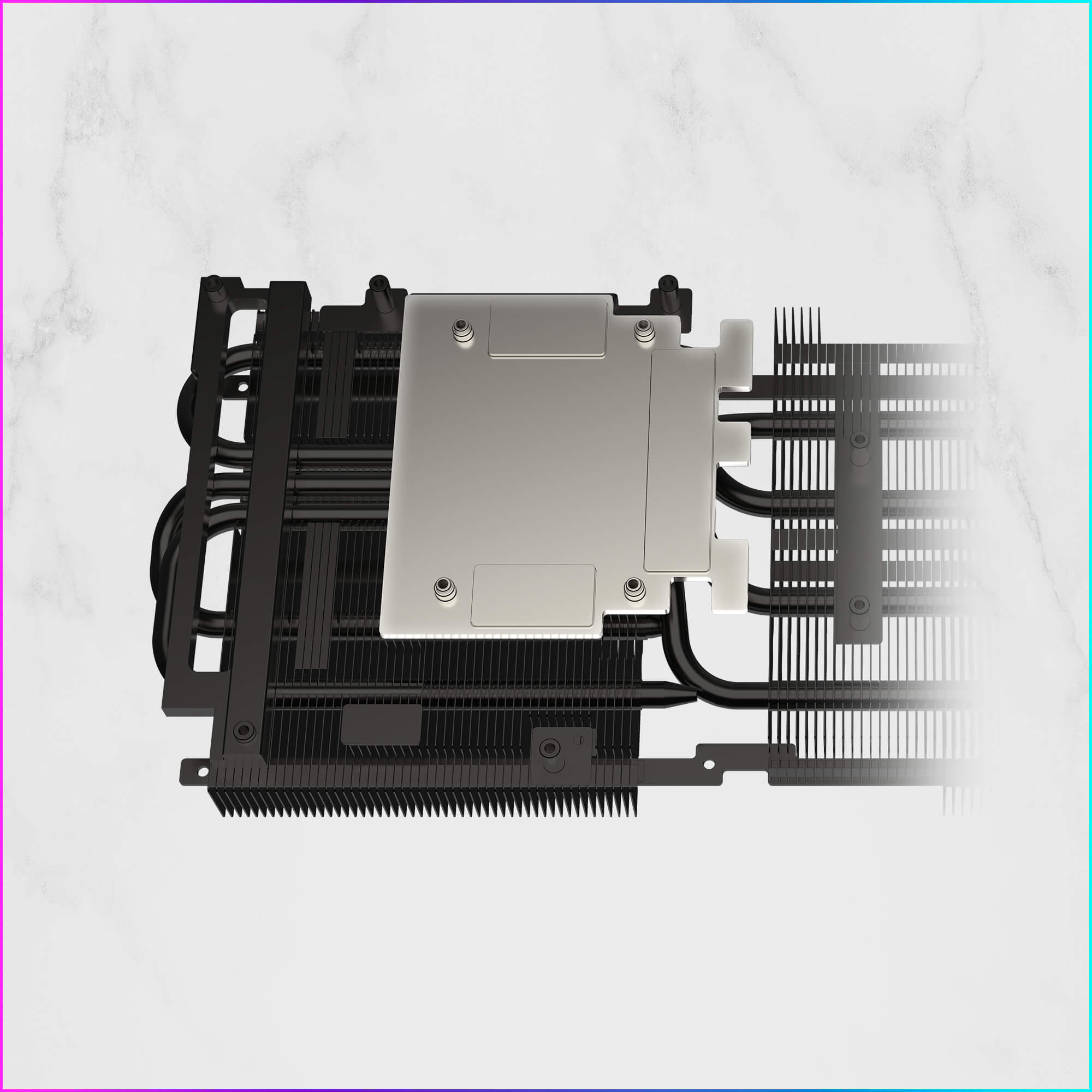 El calor generado por la GPU y los módulos de memoria se captura rápidamente mediante una sólida placa base de cobre con recubrimiento de níquel, y se transfiere de forma eficiente a los tubos principales.