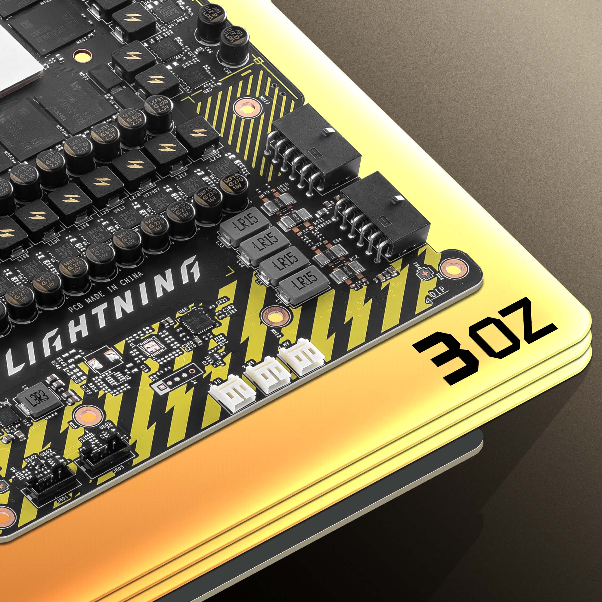 - PCB personalizado: Un PCB reforzado con cobre de 3 oz y componentes premium que ofrece una conductividad superior, más estabilidad y un rendimiento extremo en overclocking.
