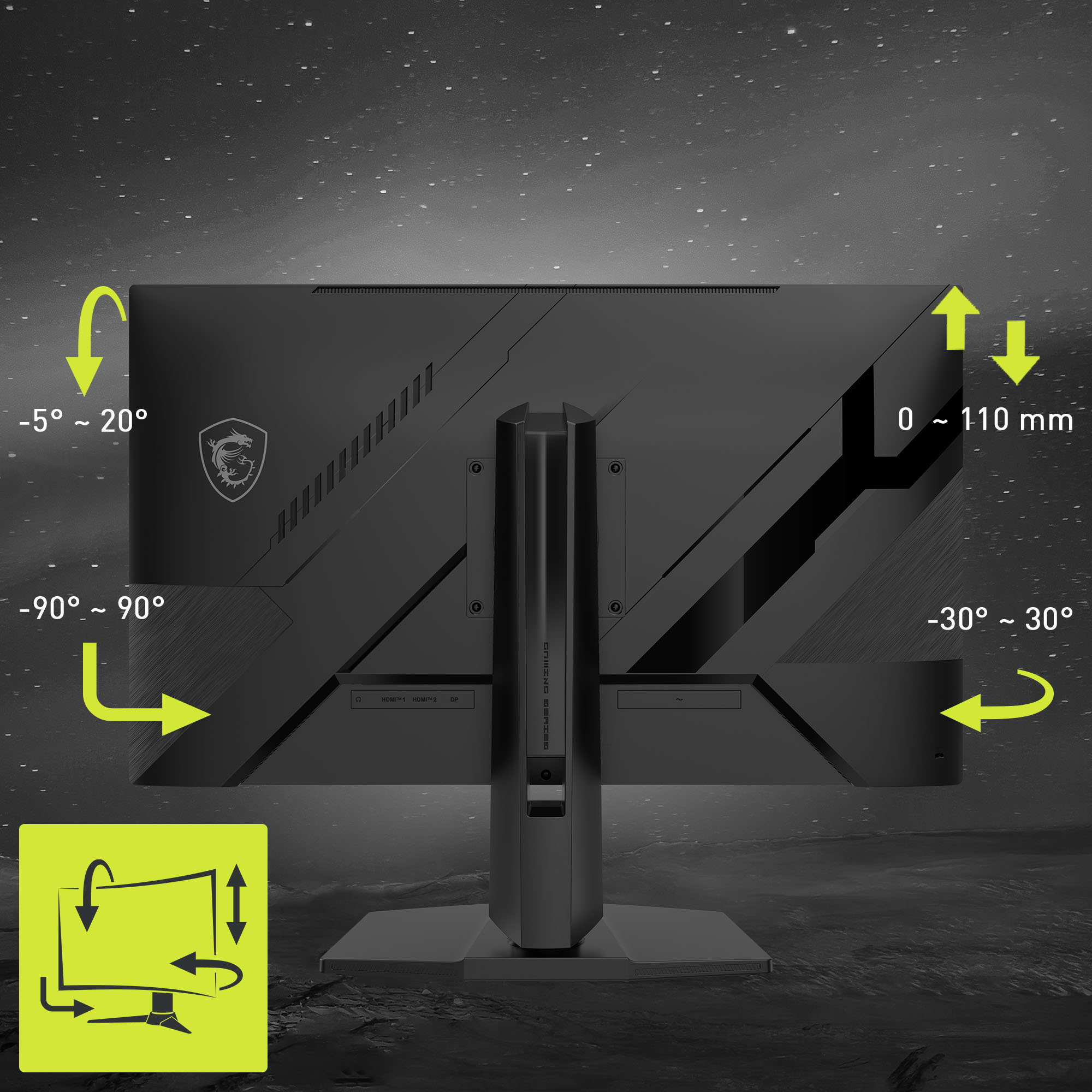 El marco del monitor cuenta con un soporte ajustable en pivote (-90°~90°), giratorio (-30°~30°), inclinación (-5°~20°) y altura (0~110 mm) y es compatible con un montaje VESA estándar de 100mm*.