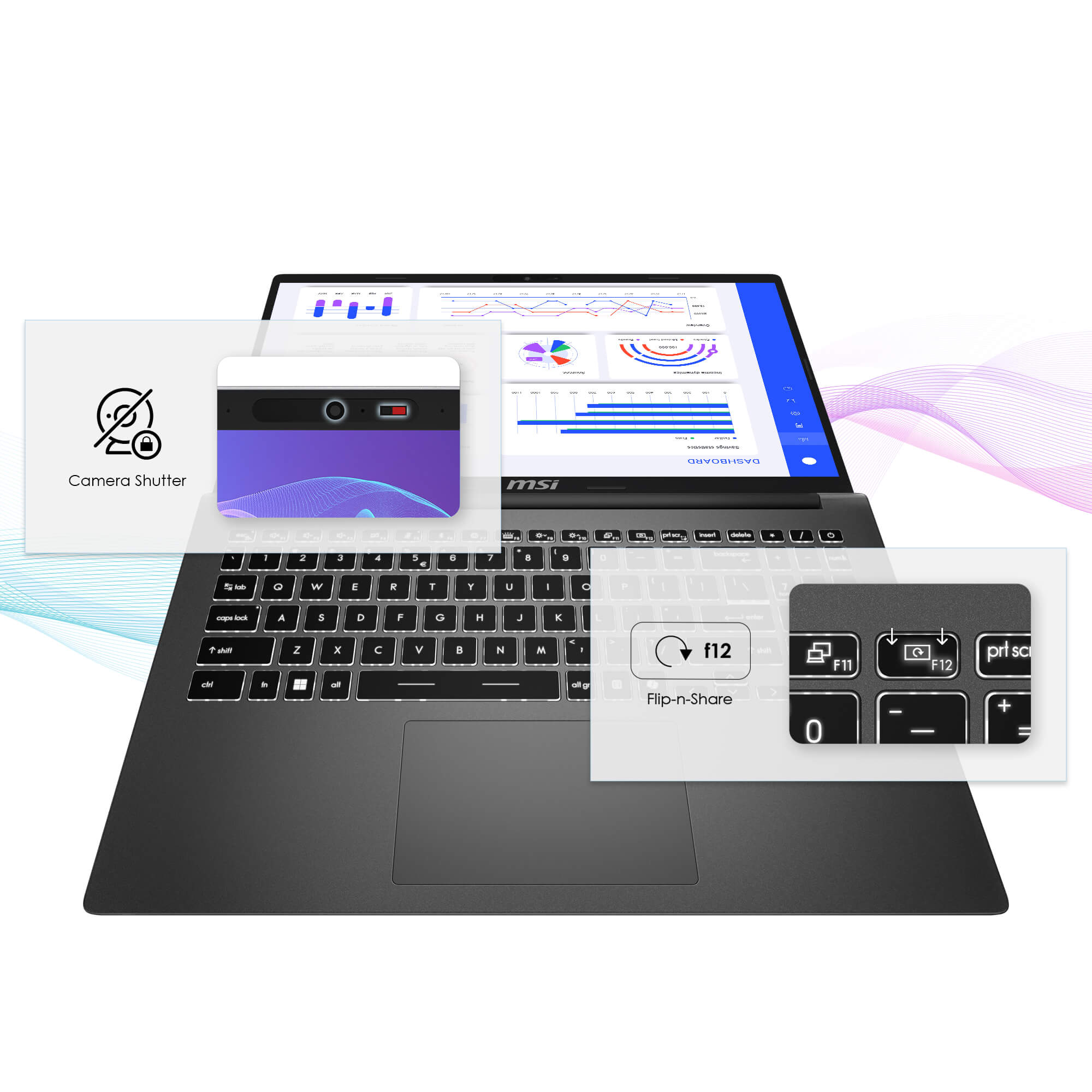 Incluye un touchpad más grande, teclado completo retroiluminado con recorrido de tecla de 1,7 mm y función Flip-n-Share con apertura de 180°. Además, puedes cerrar la cámara del portátil mediante un obturador físico para garantizar una experiencia más segura y privada.