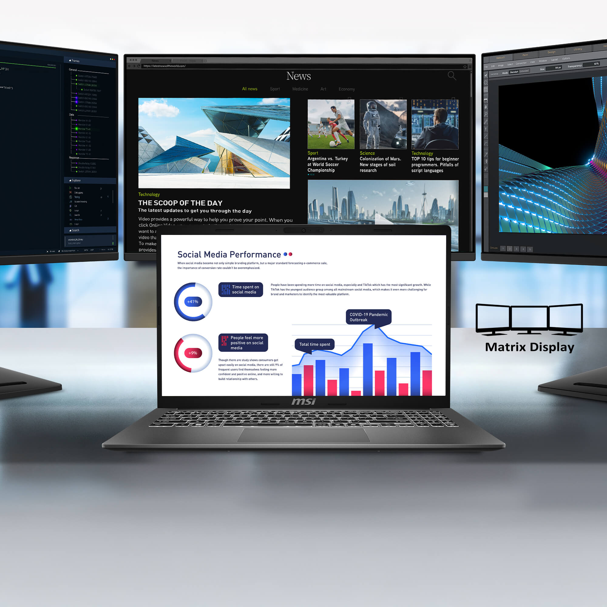Conecta hasta tres monitores adicionales mediante los puertos HDMI™ y Type-C para crear una configuración multi-pantalla (Matrix Display 1+3), aumentando tu productividad con un multitarea fluido.