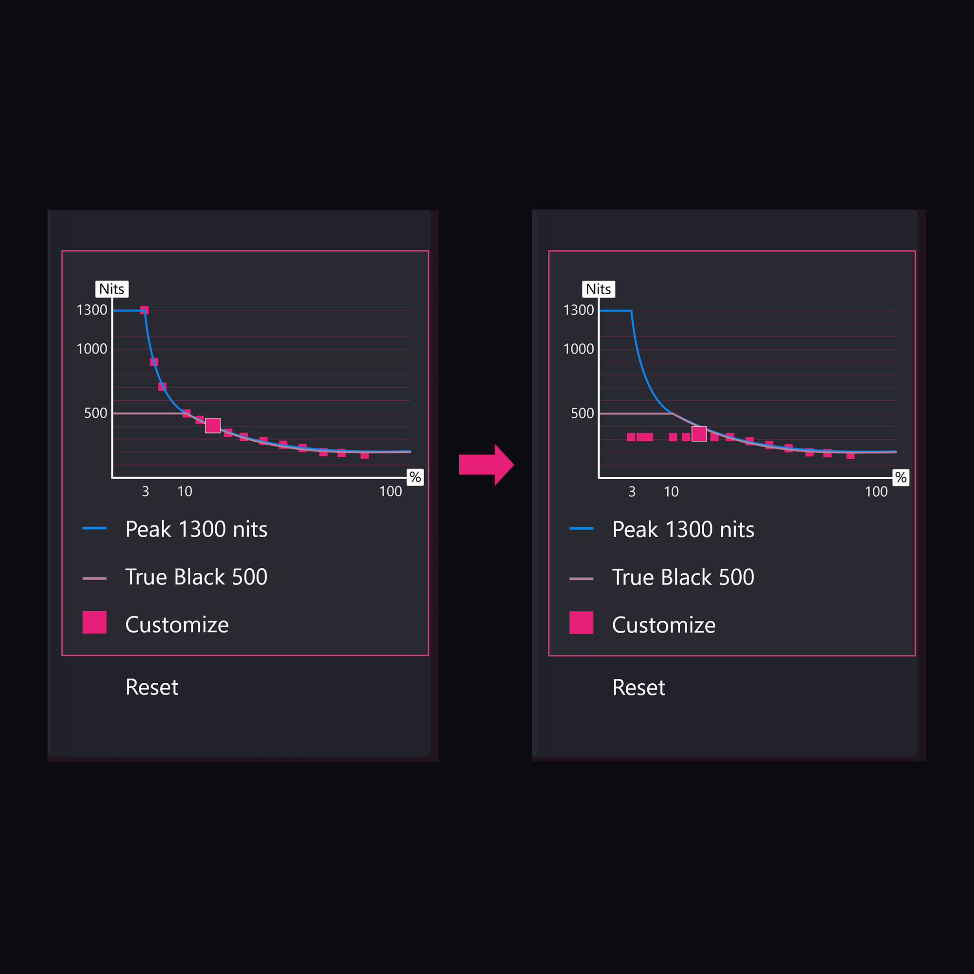 - Luminancia uniforme: Personalización de la curva HDR que te permite personalizar la curva HDR y disfrutar de una experiencia HDR suave y uniforme