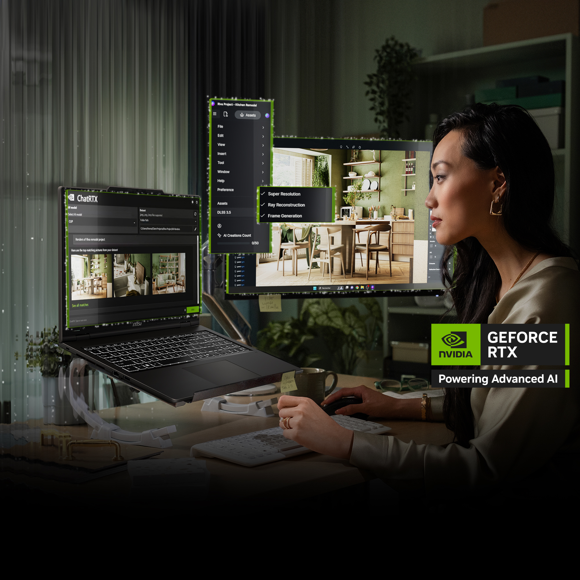 Actualiza tu experiencia con IA avanzada gracias a las GPU NVIDIA GeForce RTX™ . Juega a títulos exigentes con más fotogramas por segundo, renderiza contenido 3D y vídeo más rápido y trabaja de forma más inteligente con asistentes generativos y aplicaciones potenciadas por IA.